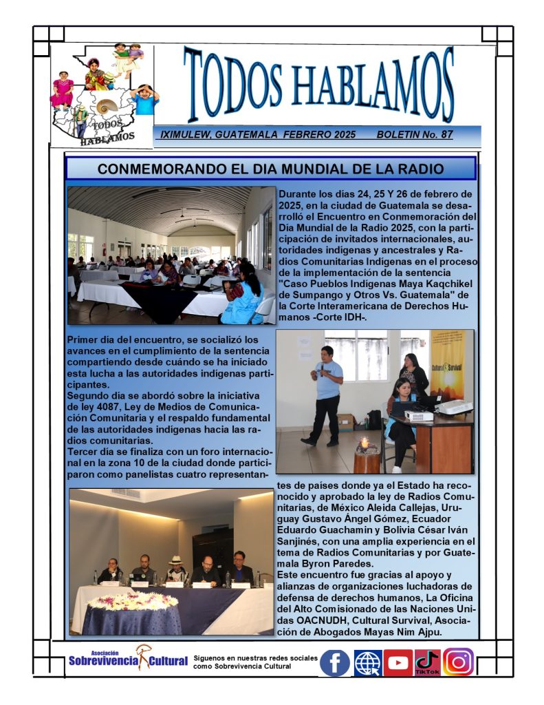 Asociación Sobrevivencia Cultural comparte el boletín informativo «TODOS HABLAMOS» número 87 que corresponde al mes de febrero de 2025 con información relevante llevadas a cabo durante el mes.