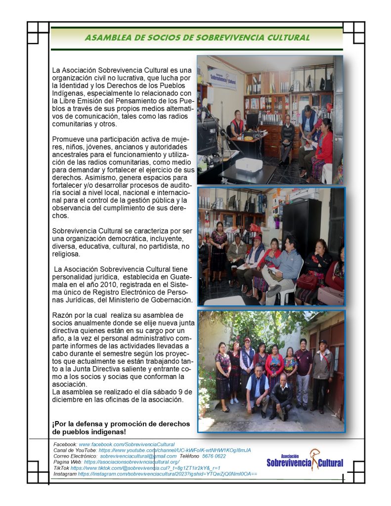 Asociación Sobrevivencia Cultural a traves del boletin informativo No. 73 «TODOS HABLAMOS» comparte información relevante sobre algunas de las actividades que se llevaron a cabo por el personal administrativo, La Red de Comunicadoras y de los miembros de algunas radios comunitarias durante el mes de diciembre.