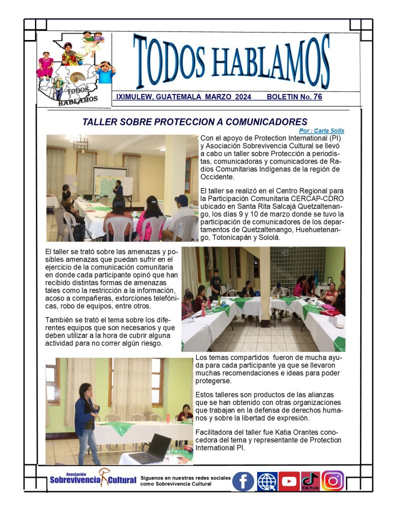 Asociación Sobrevivencia Cultural comparte el boletín informativo «TODOS HABLAMOS» número 76 del mes de marzo con información relevante sobre las actividades llevadas a cabo por miembros de La Red de Comunicadoras y del Movimiento de Radios Comunitarias Indígenas de Guatemala