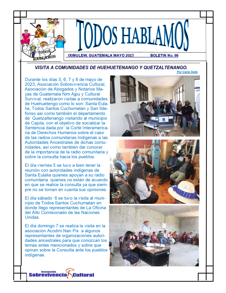 La Asociación Sobrevivencia Cultural comparte por este medio su boletín informativo «TODOS HABLAMOS», número 66 con información sobre algunas de las actividades que se llevaron a cabo durante el mes.