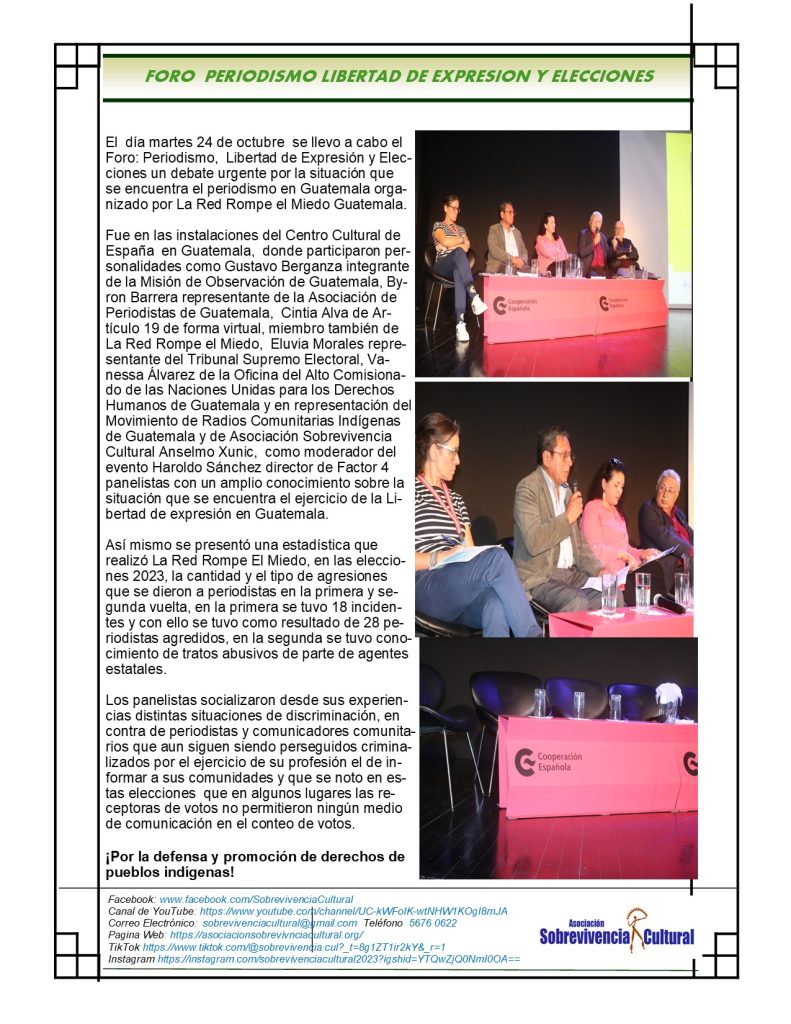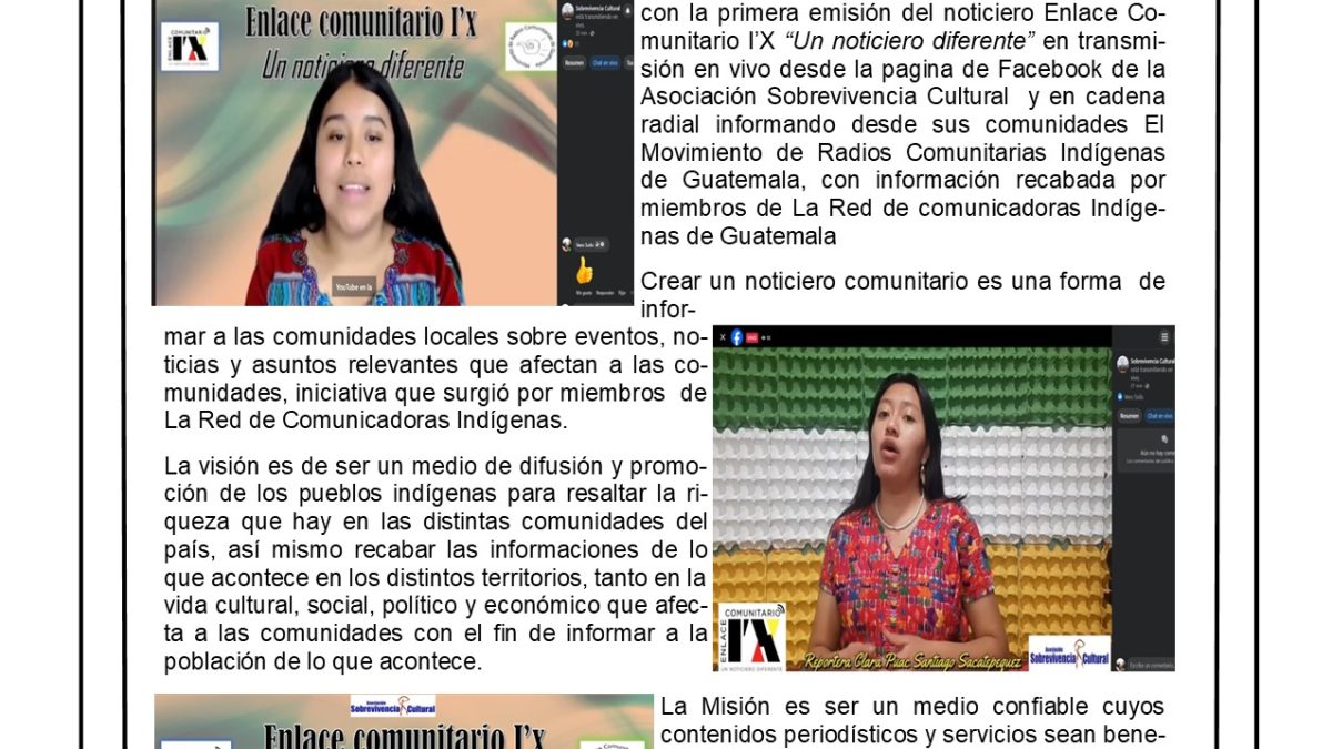 Sobrevivencia Cultural comparte su boletín informativo «TODOS HABLAMOS» número 71 correspondiente al mes de octubre, con el objetivo de informar sobre algunas actividades relevantes llevadas a cabo en el mes por La Red de comunicadoras indígenas y del Movimiento de Radios Comunitarias Indígenas de Guatemala.