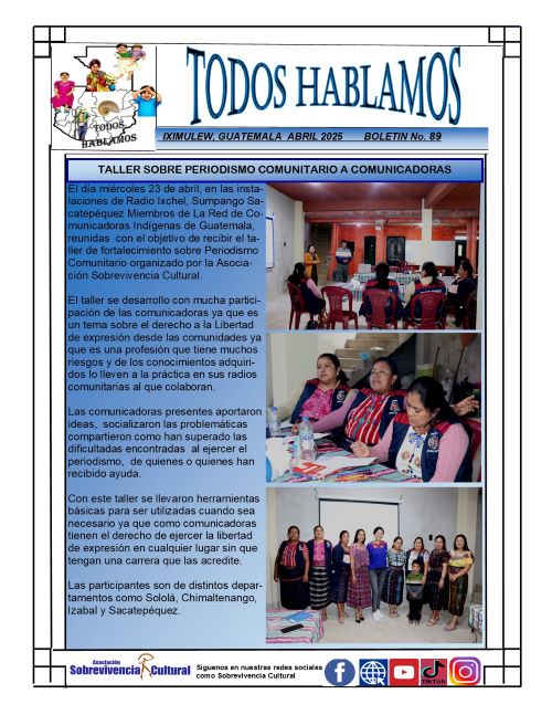 Compartimos el boletín informativo «TODOS HABLAMOS» número 92 con informacion relevante sobre actividades llevada a cabo por miembros de la Red de Comunicadoras Indígenas de Guatemala.