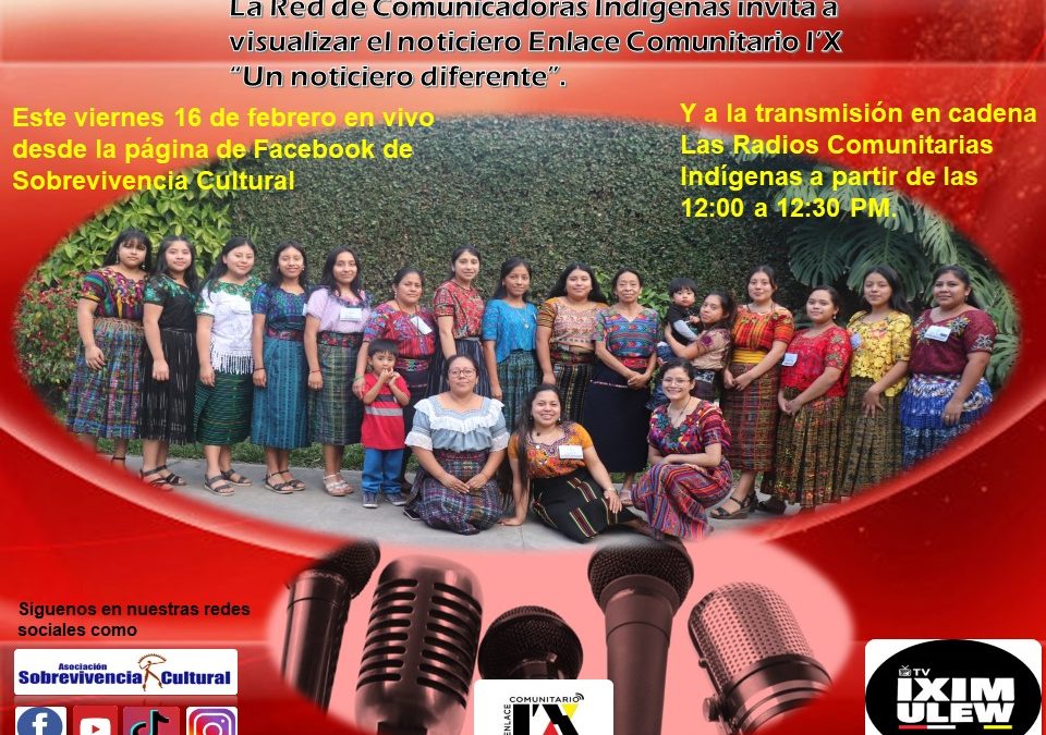 La Red de Comunicadoras Indígenas de Guatemala invita a otra transmisión del noticiero Enlace Comunitario I’X «Un noticiero diferente a su décima novena emisión el día viernes 16 de febrero a partir de las 12 del mediodía en su transmisión en vivo desde la página de facebook de Sobrevivencia Cultural.
