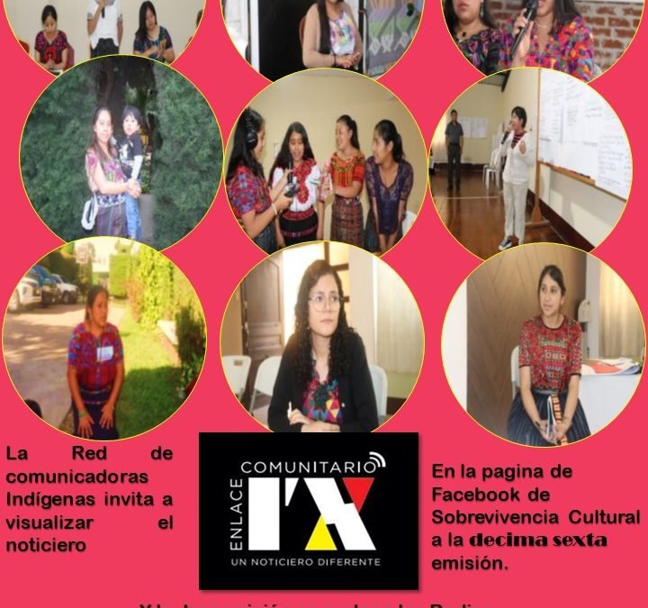 La Red de comunicadoras Indígenas invita cordialmente a visualizar la décima sexta emisión del noticiero Enlace Comunitario I’X «Un noticiero diferente», con notas producidas con información relevante desde sus comunidades acompañenos mañana viernes 26 de enero empunto de las 12 del mediodía.