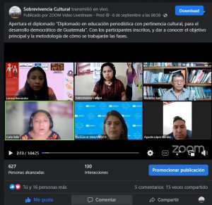 El día 8 de septiembre en la plataforma de Zoom se da la Apertura del Diplomado en Educación Periodística con Pertinencia Cultural para el desarrollo democrático de Guatemala a comunicadores y comunicadoras de distintos medios de comunicación y organizaciones que desean ampliar y fortalecer sus conocimientos para poder aplicar dentro del medio al cual pertenece.