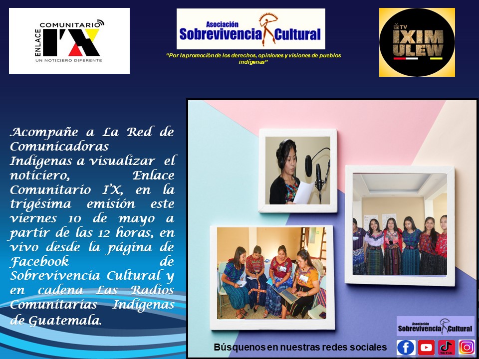 Este y todos los viernes a partir de las 12 del mediodía, por facebook de Sobrevivencia Cultural y en cadena las Radios Comunitarias Indígenas de Guatemala, con el apoyo de TV Iximulew