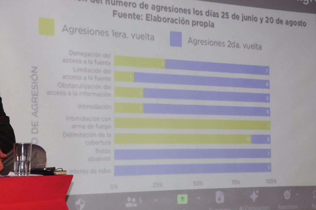 Se presentó una estadística que realizó la Red Rompe El Miedo, en las elecciones 2023, cantidad y el tipo de agresiones a periodistas en la primera y segunda vuelta, en la primera se tuvo 18 incidentes y con ello se tuvo como resultado 28 periodistas agredidos, en la segunda se tuvo conocimiento de tratos abusivos de parte de agentes estatales.
