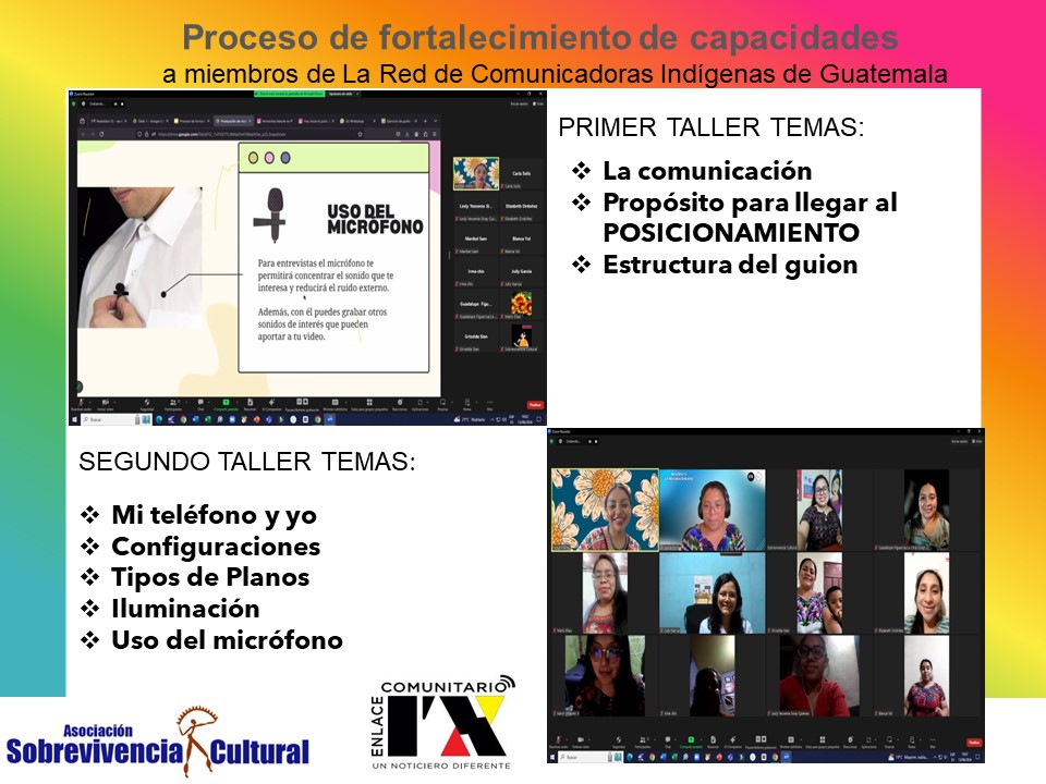 Durante los días jueves del mes de junio de forma virtual en la plataforma de Zoom, se esta llevando a cabo talleres de fortalecimiento de capacidades a La Red de Comunicadoras Indígenas de Guatemala quienes son reporteras y presentadoras del noticiero Enlace Comunitario I’X “Un noticiero diferente” con el objetivo de que puedan mejorar sus técnicas de grabación, edición, y lograr el posicionamiento tanto personal y como parte del noticiero.