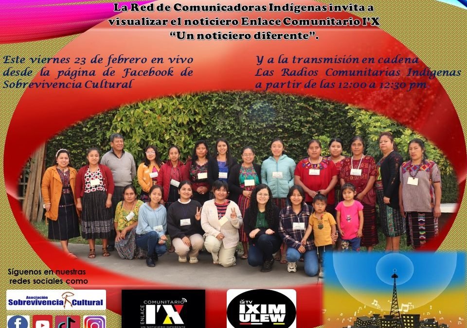 Acompañe a La Red de Comunicadoras Indígenas a visualizar la vigésima emisión del noticiero Enlace Comunitario I’X «Un noticiero diferente» en vivo desde la página de facebook de la Asociación Sobrevivencia Cultural, mañana 23 de febrero desde las 12 en punto del mediodía.